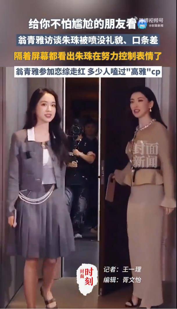 如果说礼仪缺失是开场暴击,那接下来的采访环节则成了大型业务能力“塌方”现场。作为伦敦艺术大学传媒学院的毕业生,翁青雅的提问全程卡顿、忘词,对品牌理念的阐述生硬如“背课文”,甚至连品牌名都念不清楚。逻辑混乱到需要工作人员紧急救场,其对朱珠的新剧角色和穿搭态度也显得一无所知。这一切,都被镜头忠实记录,与对面始终得体微笑、甚至主动帮她重构问题(“你真正想问的是…?”)的朱珠形成惨烈对比。