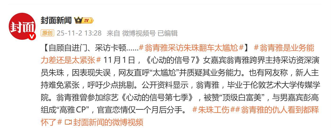 一句“后面有人吗?”,资深演员朱珠这句温和的询问,反倒成了整场采访最显主持人功底的瞬间——可惜,是反向的。据11月2日报道,《心动的信号7》女嘉宾翁青雅跨界主持采访朱珠的片段冲上热搜,其灾难级表现被网友贴上“太尴尬”标签,更引爆了一场关于“流量与专业”的全民大讨论。