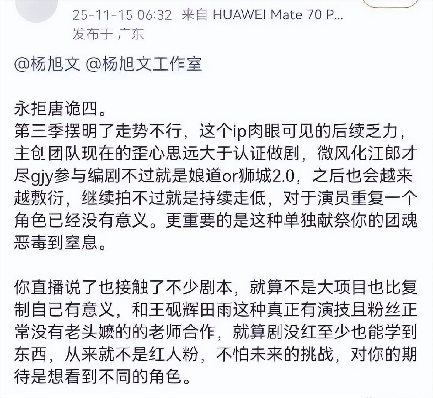 2025年11月16日,“杨旭文粉丝永拒唐诡4”(即《唐朝诡事录》第四季)的诉求已成为粉丝圈层的公开行动,顺利引发争议!